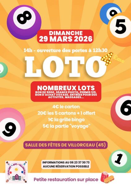 L' APE organise un loto le29 mars 2026 à la salle des fêtes de Villorceau